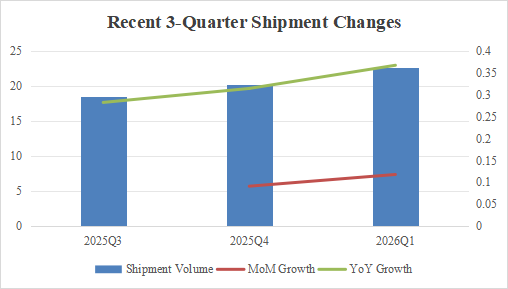Benefiting from the explosive sales growth of new energy vehicles, automotive PCB shipments further climbed to 2.27 billion pieces in the first quarter of 2026, representing a year-on-year growth of 36.8% and a month-on-month increase of 11.8%. Among them, the year-on-year growth rates of shipments for high-voltage thick copper boards and rigid-flexible PCBs both exceeded 40%, which is in line with the 35%-45% growth rate of high-end automotive product orders among domestic leading PCB enterprises. These high-end products have become core categories driving PCB shipment growth, adapting to the high-end and large-scale development trend of automotive PCBs.